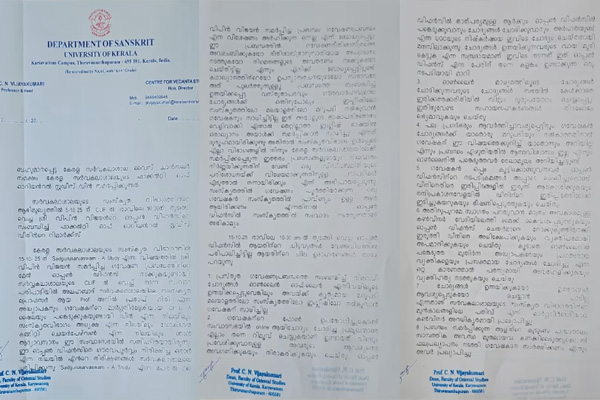 വിദ്യാർത്ഥിക്ക് ഓപ്പൺ ഡിഫൻസിൽ ചോദ്യങ്ങൾക്ക് ഉത്തരമുണ്ടായില്ലെന്നും സംസ്കൃതം അറിയില്ലെന്നും വകുപ്പ് മേധാവിയുടെ കത്തിൽ പറയുന്നു. സദ്ഗുരു സർവസ്വം, ഒരു പഠനം എന്ന പേരിൽ ചട്ടമ്പിസ്വാമികളെ കുറിച്ചുള്ളതാണ്.